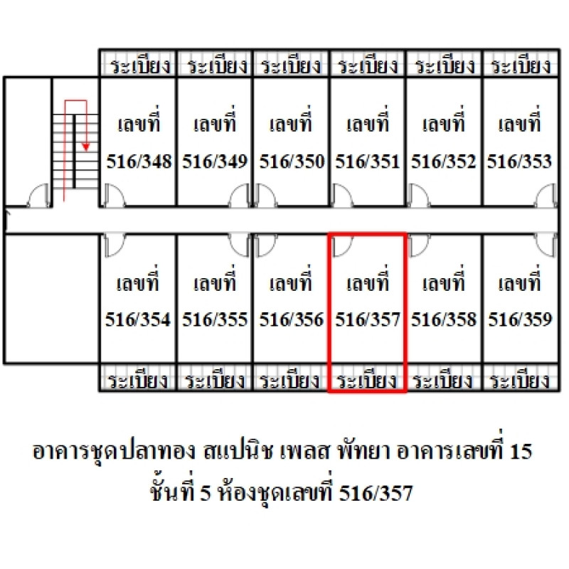 ห้องชุดพักอาศัย เลขที่ 516/357 ชั้นที่ 5 อาคารเลขที่ 15 ชื่ออาคารชุด ปลาทอง สแปนิช เพลส พัทยา ทะเบียนอาคารชุดเลขที่ 11/2535อัตราส่วนแห่งกรรมสิทธิ์ในทรัพย์ส่วนกลาง : 439 ส่วน ใน 26,540 ส่วนข้อมูลอาคารชุด : อาคารสูง 5 ชั้น มีจำนวนห้องชุดประมาณ 30 ห้อง/อาคาร โดยโครงการฯ มีทั้งหมด 10 อาคารข้อมูล ณ วันที่ 21 ก.พ. 68 ค่าส่วนกลางประมาณ 500.00 บาท/เดือน