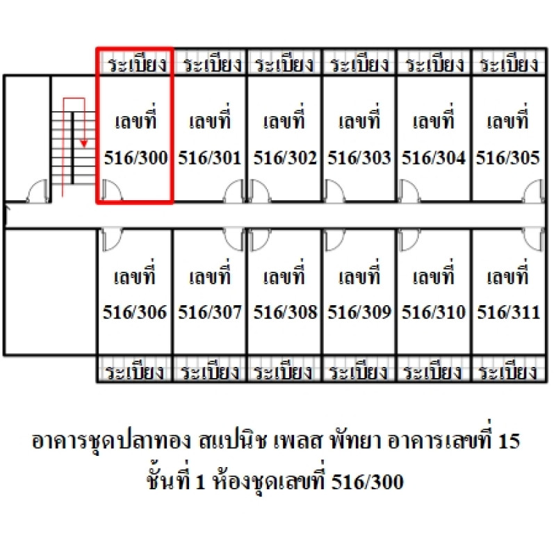 ห้องชุดพักอาศัย เลขที่ 516/300 ชั้นที่ 1 อาคารเลขที่ 15 ชื่ออาคารชุด ปลาทอง สแปนิช เพลส พัทยา ทะเบียนอาคารชุดเลขที่ 11/2535อัตราส่วนแห่งกรรมสิทธิ์ในทรัพย์ส่วนกลาง : 419 ส่วน ใน 26,540 ส่วนข้อมูลอาคารชุด : อาคารสูง 5 ชั้น มีจำนวนห้องชุดประมาณ 30 ห้อง/อาคาร โดยโครงการฯ มีทั้งหมด 10 อาคารข้อมูล ณ วันที่ 21 ก.พ. 68 ค่าส่วนกลางประมาณ 500.00 บาท/เดือน