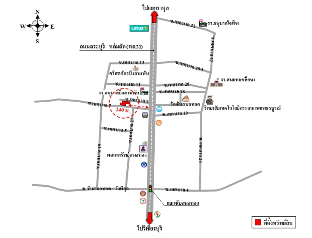 ที่ดินจำนวน 2 แปลงติดต่อกัน เป็นรูปหลายเหลี่ยม ตั้งอยู่ติดถนน 2 ด้าน ขนาดแปลงที่ดินด้านทิศใต้ติดซอยเทศบาล 7 กว้างประมาณ 31 ม. และด้านทิศเหนือติดซอยเทศบาล 9 กว้างประมาณ 48 ม. ลึกสุดประมาณ 49 ม.บสส. รับโอนกรรมสิทธิ์สิ่งปลูกสร้างระบุเป็นโกดังเก็บของ (เป็นซีเมนต์) เลขที่ 161/5ถนนผ่านหน้าทรัพย์สิน ได้แก่ ซอยเทศบาล 7 และซอยเทศบาล 9 เป็นทางสาธารณประโยชน์ ผิวจราจรลูกรัง กว้างประมาณ 4 ม. เขตทางกว้างประมาณ 6 ม.