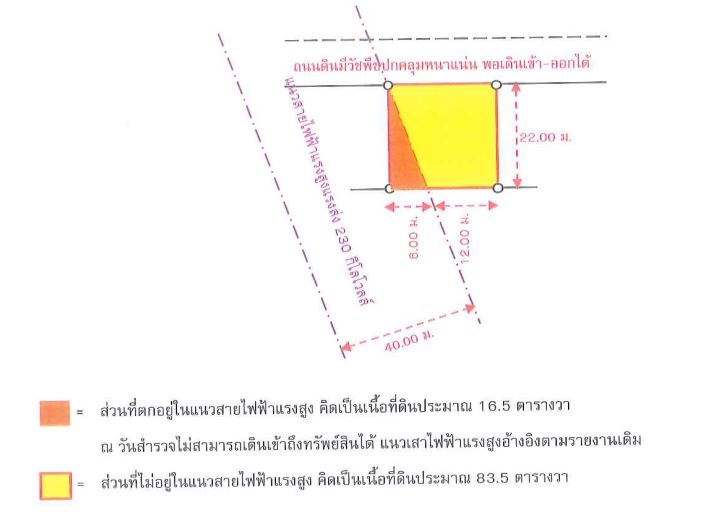 ที่ดินเปล่า หน้ากว้างติดถนนซอยประมาณ 18 เมตร, ลึกประมาณ 22 เมตร, ที่ดินบ้างส่วนอยู่ภายใต้แนวสายไฟฟ้าแรงสูง คิดเป็นเนื้อที่ประมาณ 16.5 ตรว. ส่วนที่ไม่อยู่ในแนวสายไฟฟ้าประมาณ 83.5 ตร.ว.