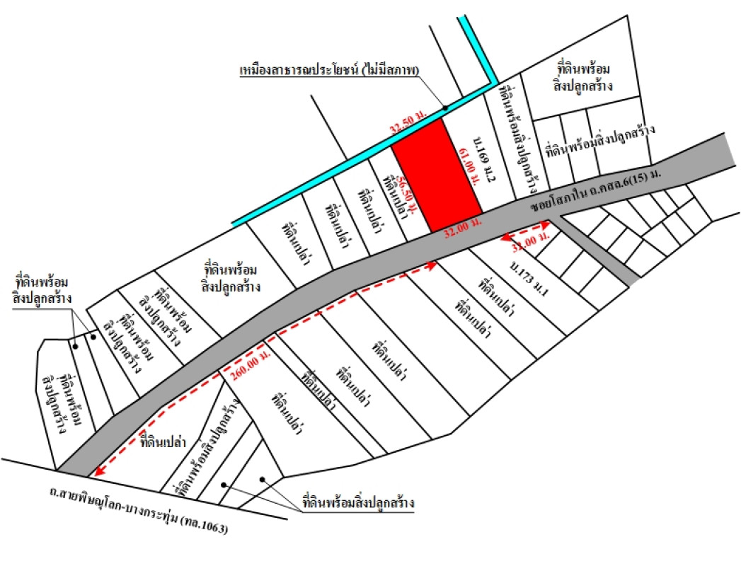 ที่ดินเป็นรูปคล้ายสี่เหลี่ยมคางหมู ขนาดแปลงที่ดินด้านทิศใต้ติดถนน กว้างประมาณ 32 ม. ลึกสุดประมาณ 61 ม. และด้านทิศเหนือติดเหมืองสาธารณประโยชน์ (ไม่มีสภาพ) กว้างประมาณ 32.5 ม. ระดับที่ดินต่ำกว่าถนนประมาณ 0.2 ม.ถนนผ่านหน้าทรัพย์สิน ได้แก่ ซอยโสภาใน เป็นทางสาธารณประโยชน์ ผิวจราจรคอนกรีต กว้างประมาณ 6 ม. เขตทางกว้างประมาณ 15 ม.
