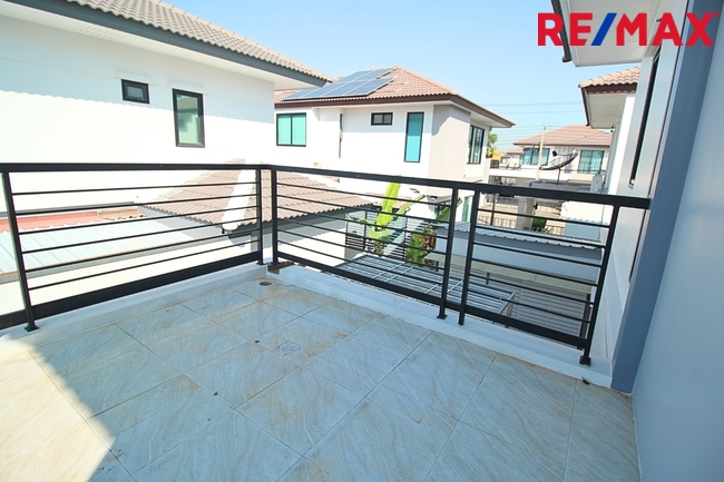 b. หลังบ้าน : ครัวหลังบ้านแบบโปร่ง ด้านหลังที่ติดกับบ้านด้านหลัง ทำเป็นระแนงไม้แบบเลื่อนปิดบังสายตาได้ หรือ จะเปิดแบบโปร่งเฉพาะส่วนได้ มีการต่อเติมหลังคาเรียบร้อย พร้อมเคาน์เตอร์ครัวปูน ปูพื้นกระเบื้อง รองรับการทำครัวหนัก ดูแลทำความสะอาดง่ายc. ระเบียงชั้น 2 : อยู่ในโครงสร้างของตัวบ้าน จึงทำราวกันตกเพื่อวางของ หรือ จุด Service ของช่าง สะดวก เป็น Walkway สำหรับเครื่องปรับอากาศได้