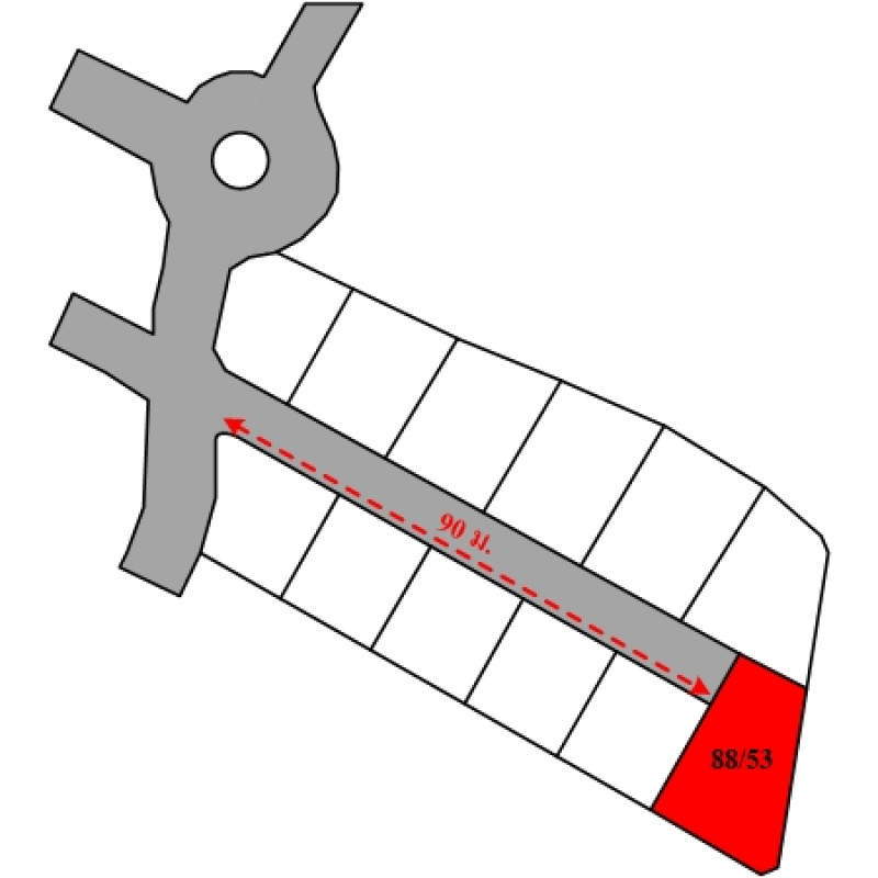 ที่ดินเป็นรูปหลายเหลี่ยม ขนาดแปลงที่ดินด้านทิศตะวันตก กว้างประมาณ 27 ม. (ส่วนที่ติดถนน กว้างประมาณ 8 ม.) ลึกสุดประมาณ 19.5 ม.บสส. รับโอนกรรมสิทธิ์สิ่งปลูกสร้างระบุเป็นบ้านพักอาศัยตึกชั้นเดียว เลขที่ 88/53, โรงจอดรถถนนผ่านหน้าทรัพย์สิน ได้แก่ ถนนภายในโครงการฯ ซอย 4 เป็นทางในโครงการจัดสรรที่ได้รับอนุญาตแล้ว ผิวจราจรคอนกรีต กว้างประมาณ 6 ม. เขตทางกว้างประมาณ 8 ม.