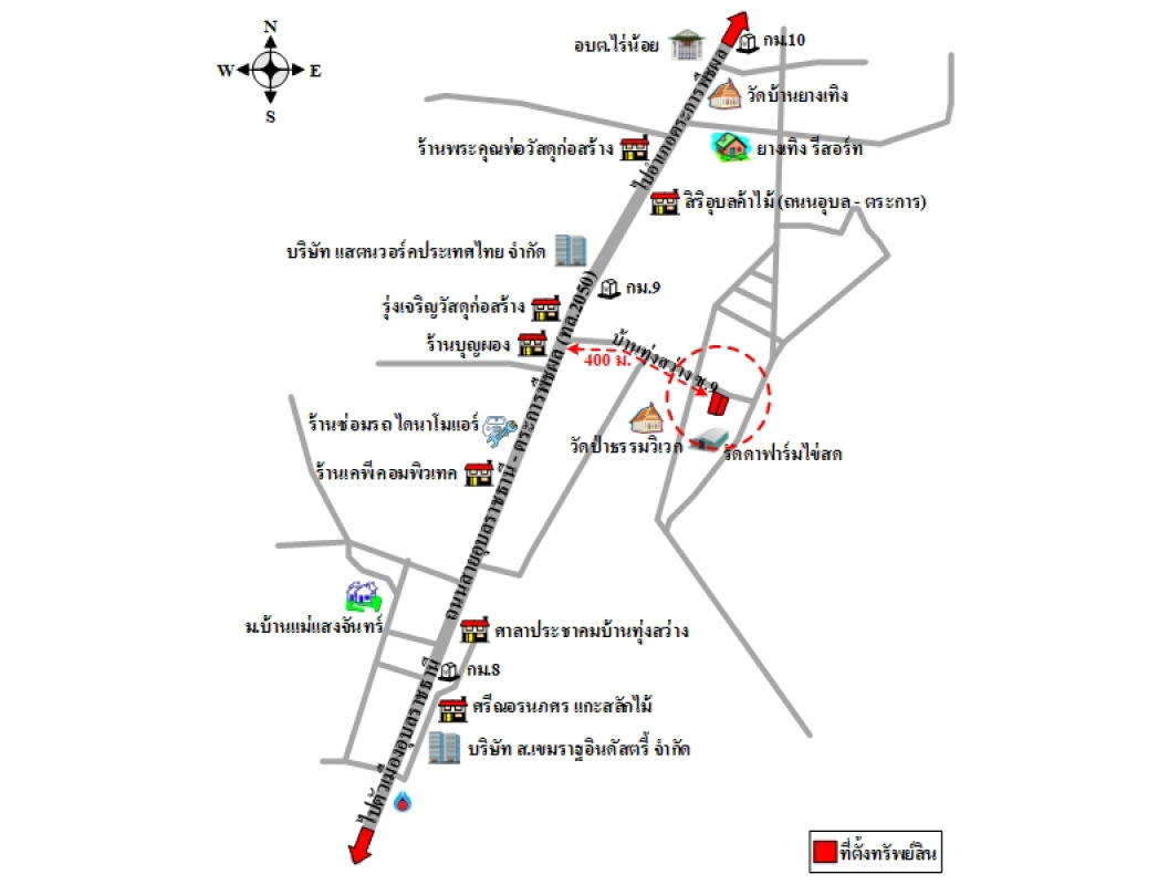 ที่ดินจำนวน 2 แปลงติดต่อกัน เป็นรูปสี่เหลี่ยมด้านไม่เท่า ขนาดแปลงที่ดินด้านทิศเหนือติดถนน กว้างประมาณ 38 ม. ลึกสุดประมาณ 50 ม.บสส. รับโอนกรรมสิทธิ์สิ่งปลูกสร้างระบุเป็นบ้านพักอาศัยตึกชั้นเดียว ไม่ปรากฏเลขที่ถนนผ่านหน้าทรัพย์สิน ได้แก่ บ้านทุ่งสว่าง ซอย 9 เป็นทางสาธารณประโยชน์ ผิวจราจรคอนกรีต กว้างประมาณ 4 ม. เขตทางกว้างประมาณ 6 ม.