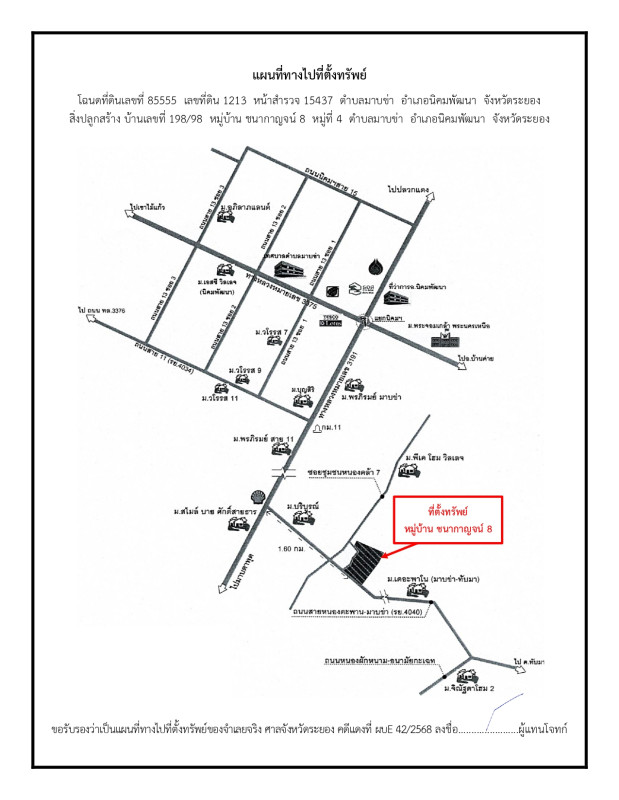 ศูนย์ข้อมูลฯ ได้ทำการตรวจสอบตำแหน่งที่ตั้งทรัพย์บนแผนที่ที่ปรากฎอยู่บนเว็บไซต์ โดยอาศัยข้อมูลจากแหล่งข้อมูลต่างๆ ที่เชื่อถือได้ เพื่อให้ตำแหน่งทรัพย์บนแผนที่ ใช้อ้างอิงท่านไปยังที่ตั้งของทรัพย์นั้นๆ โดยประมาณ ทั้งนี้ศูนย์ข้อมูลฯ ไม่สามารถยืนยันความถูกต้องของตำแหน่งทรัพย์ได้ ดังนั้น ทางศูนย์ข้อมูลฯ ขอสงวนสิทธิ์ไม่รับผิดชอบต่อข้อผิดพลาดทางตำแหน่งทรัพย์ที่เกิดขึ้นบนแผนที่ ผู้นำข้อมูลไปใช้พึงใช้วิจารณญาณและตรวจสอบตามความเหมาะสม
