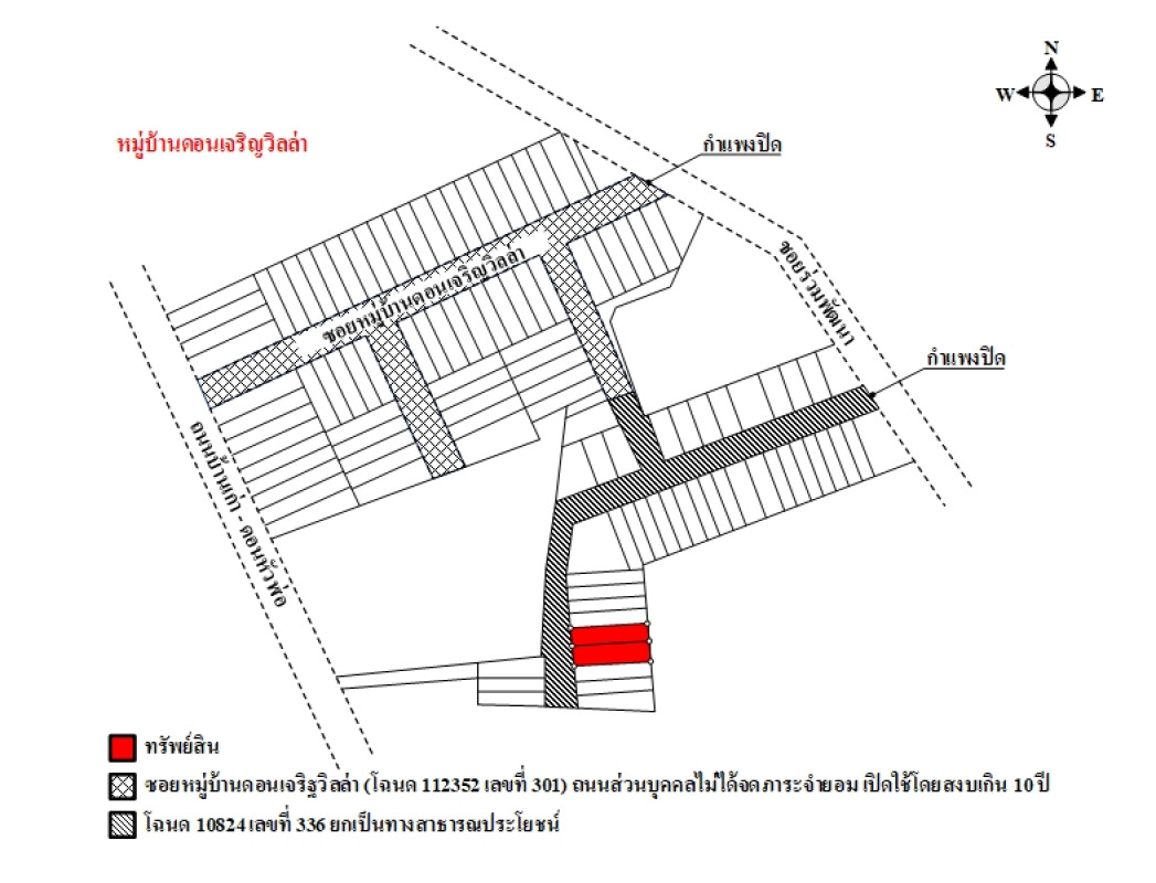 ที่ดินจำนวน 2 แปลงติดต่อกัน เป็นรูปสี่เหลี่ยมผืนผ้า ขนาดแปลงที่ดินด้านทิศตะวันตกติดถนน กว้างประมาณ 8 ม. ลึกประมาณ 22.1 ม.บสส. รับโอนกรรมสิทธิ์สิ่งปลูกสร้างระบุเป็นทาวน์เฮ้าส์ 2 ชั้น จำนวน 2 หลัง เลขที่ 44/101-102 และโรงจอดรถ ทางเข้า-ออกทรัพย์สิน ต้องใช้ทางเข้า-ออกผ่านโฉนดที่ดินเลขที่ 112352 เลขที่ดิน 901 ซึ่งยังไม่ได้จดภาระจำยอมให้กับแปลงทรัพย์สิน แต่จากลักษณะการแบ่งแยก มีการใช้เป็นถนนในโครงการและใช้เข้า-ออกอย่างเปิดเผยมานานเกินกว่า 10 ปี ทรัพย์สินจึงสามารถเข้า-ออกผ่านทางดังกล่าวได้ถนนผ่านหน้าทรัพย์สิน ได้แก่ ถนนภายในโครงการฯ โฉนดที่ดินเลขที่ 10824 เลขที่ดิน 336 เป็นทางสาธารณประโยชน์ ผิวจราจร คสล. กว้างประมาณ 6 ม. เขตทางกว้างประมาณ 8 ม.++ผู้สนใจควรตรวจสอบเรื่องสิทธิในการใช้ทางให้เป็นที่พึงพอใจก่อนการเสนอซื้อ++