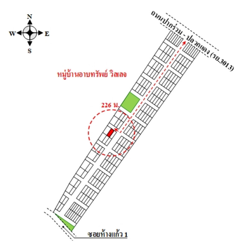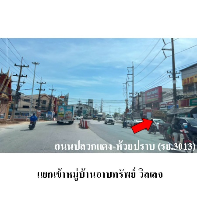 ที่ดินเป็นรูปสี่เหลี่ยมผืนผ้า ขนาดแปลงที่ดินด้านทิศเหนือติดถนน กว้างประมาณ 6 ม. เขตทางกว้างประมาณ 16 ม.บสส. รับโอนกรรมสิทธิ์สิ่งปลูกสร้างระบุเป็นทาวน์เฮ้าส์ชั้นเดียว เลขที่ 173/94, โรงจอดรถ ไม่มีเลขที่ถนนผ่านหน้าทรัพย์สิน ได้แก่ ถนนภายในหมู่บ้านอาบทรัพย์ วิลเลจ เป็นทางในโครงการจัดสรรที่ได้รับอนุญาตแล้ว ผิวจราจรคอนกรีต กว้างประมาณ 6 ม. เขตทางกว้างประมาณ 8 ม.
